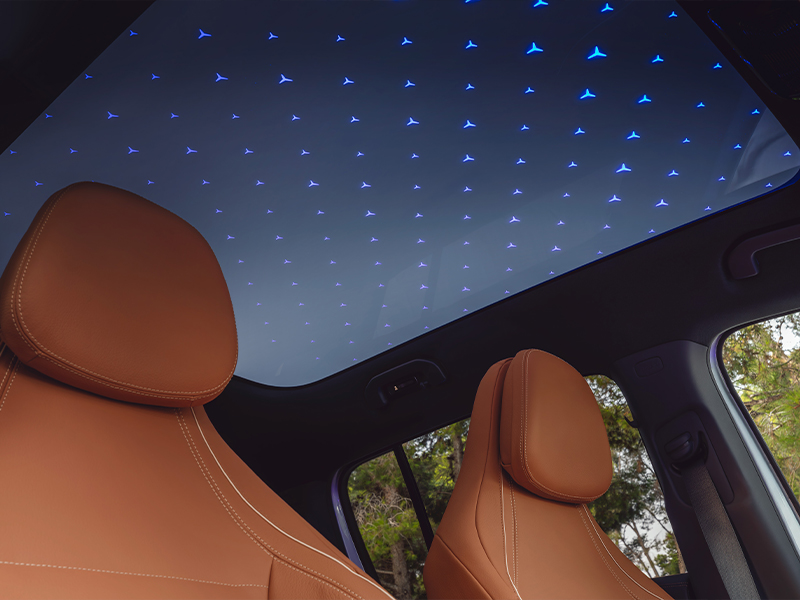 Voor een nog stijlvollere uitstraling kan het grote panoramadak optioneel zelfs worden verlicht. Het dak is verbonden met de sfeerverlichting en zorgt desgewenst voor een gepersonaliseerde sterrenhemel. Het licht wordt via led-modules vanaf de voorkant aangevoerd.
