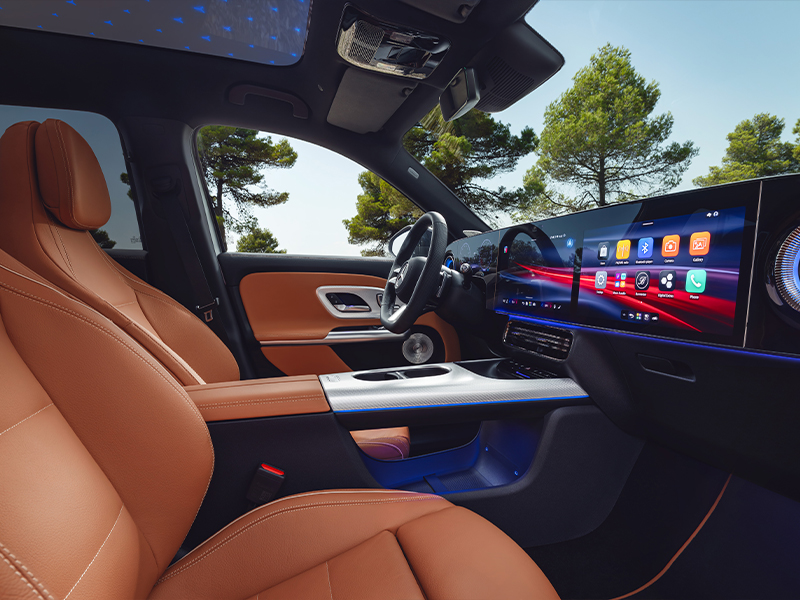 Het interieur van de volledig nieuwe GLB geeft de begrippen comfort en luxe opnieuw vorm. In plaats van het sculpturale design van het vorige model is bij de nieuwe generatie een minimalistisch designconcept toegepast waarbij de nadruk ligt op enkele iconische, hightech elementen. Het design is teruggebracht tot de essentie en zorgt voor een state-of-the-art sfeer met een elegante touch. Een highlight in het interieur is het optioneel leverbare, zwevende MBUX superscreen, dat zich over de gehele breedte van het dashboard uitstrekt.De ronde luchtuitstroomopeningen aan beide uiteinden van het MBUX superscreen zorgen voor een sportief en futuristisch effect. De buitenringen in de kleur Silver Shadow lijken te zweven voor een trechtervormige vorm. De middelste luchtuitstroomopening vervangt de gebruikelijke lamellen door een vlakke, ultramoderne behuizing. Een andere highlight zijn de portierpanelen met een concave hoofdvorm die zich naar de achtergrond lijkt te bewegen. Het grote, zwevend uitgevoerde middendeel van de portieren bevat een open opbergvak. De portiergrepen zien er met hun klassieke buisvormige design minimalistisch, maar tegelijkertijd krachtig en sportief uit.