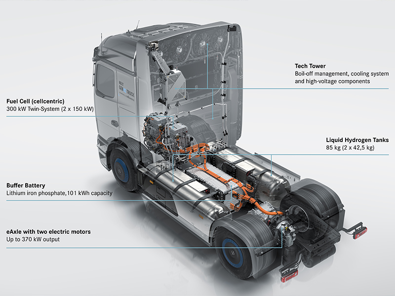 Het ontwikkelteam behield bij de ontwikkeling van het nieuwe model de bewezen sterke punten van de eerste generatie Mercedes-Benz GenH2 Truck. Vloeibare waterstof maakt een rijbereik van ruim meer dan 1.000 kilometer mogelijk met één tankvulling bij volle belading. De beproefde cellcentric BZA150-brandstofcel zet waterstof aan boord om in elektrische energie.